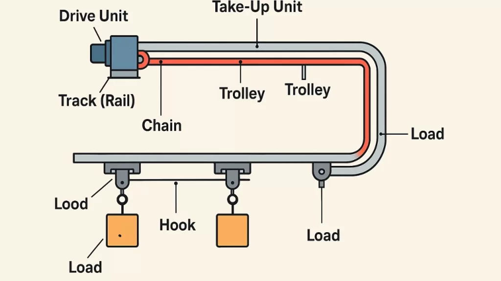 With the diagram of an overhead conveyor, we get a clear visual understanding of how the components work together. Below is an explanation of each part shown in a typical system diagram.